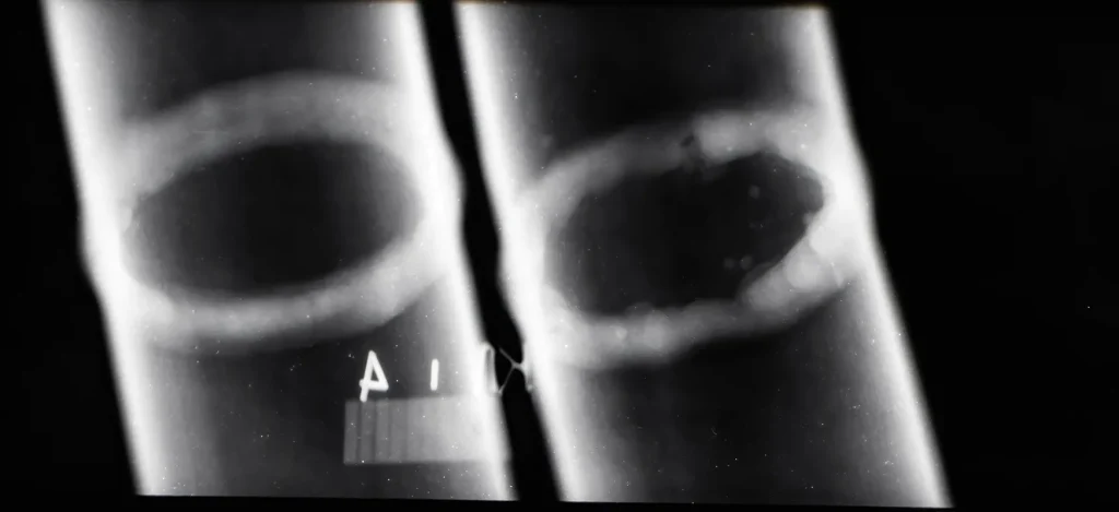 Radiographic Testing (RT) uses X-rays or gamma rays to capture detailed images of a component’s internal structure, revealing cracks, voids, porosity, and inclusions that are invisible to surface-level inspection.